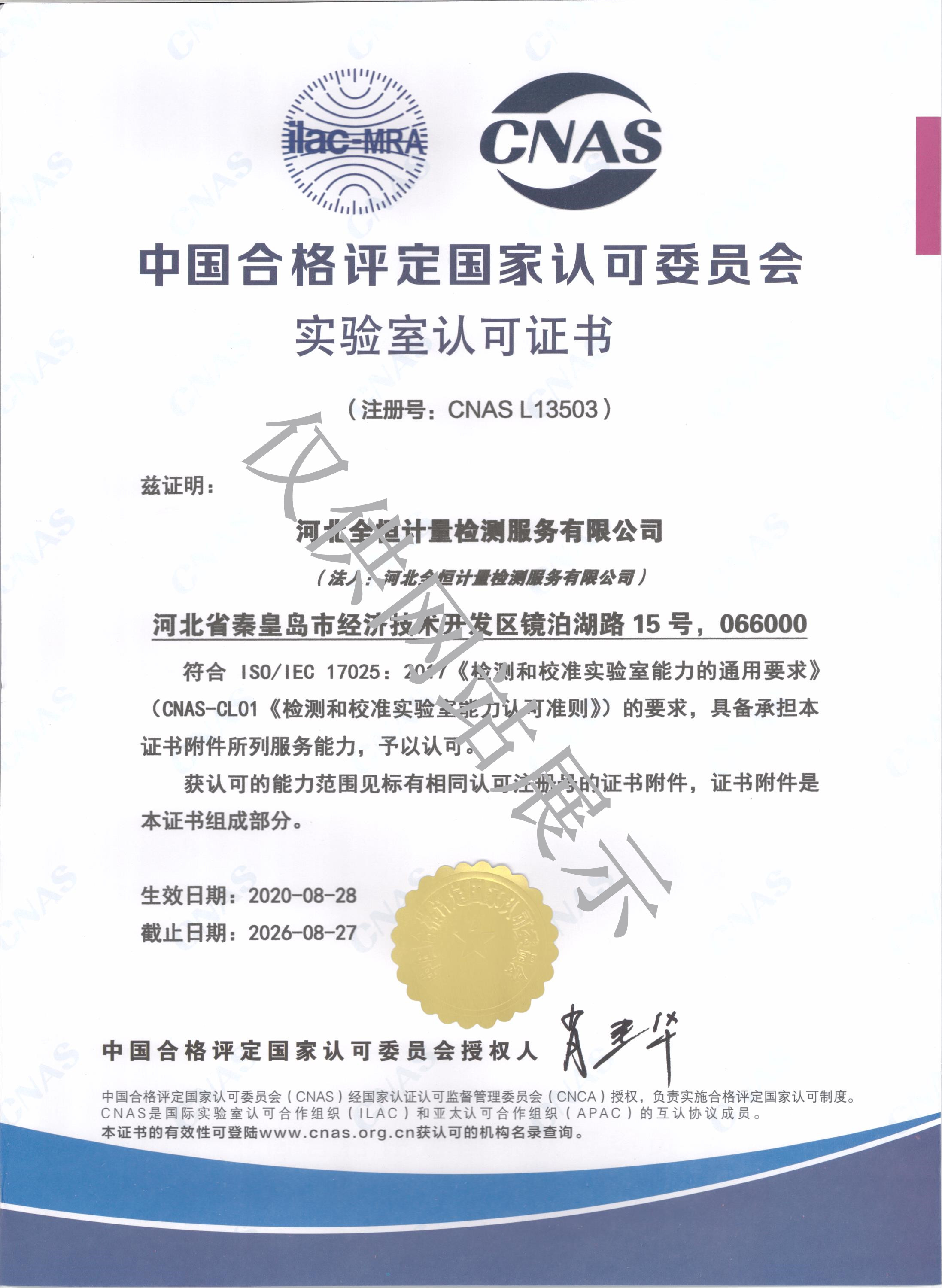 中國合格評(píng)定國家認(rèn)可委員會(huì)實(shí)驗(yàn)室認(rèn)可證書